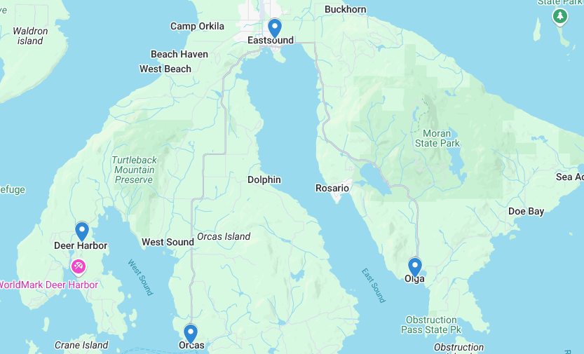 We have four places on Orcas Island where you can drop off books: at the Ferry Landing, The Deer Harbor Community Center, outside the main building, and at the Olga Store. A map with locations can be found here. Below, the blue location pins give the book drops’ general locations.