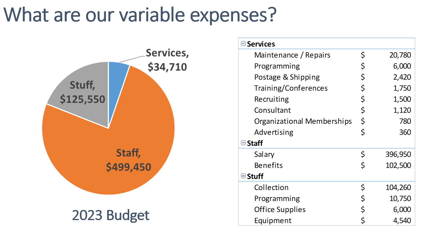 The short answer is that is what will happen if the levy is not partially restored. Forty percent of the library’s expenses are fixed (e.g., insurance). Sixty percent are variable and will be subject to reductions if the levy is not restored. Here is an illustration of the variable expenses from 2023 for a sense of what may be eliminated or reduced: