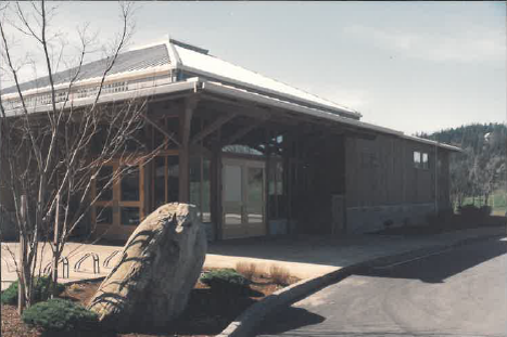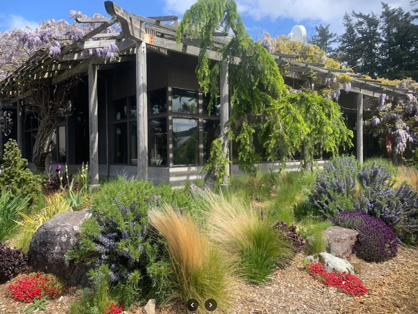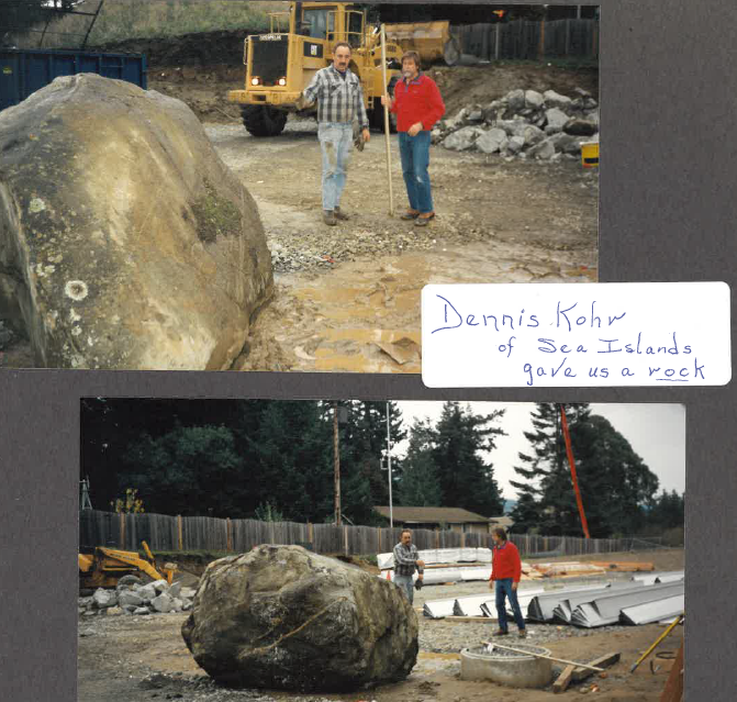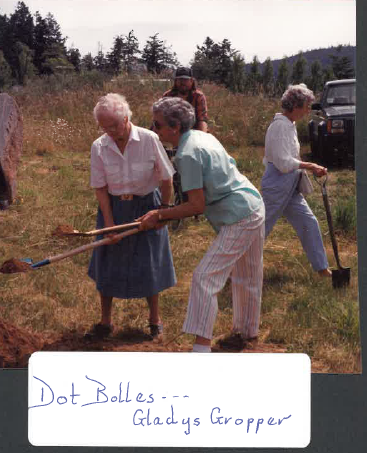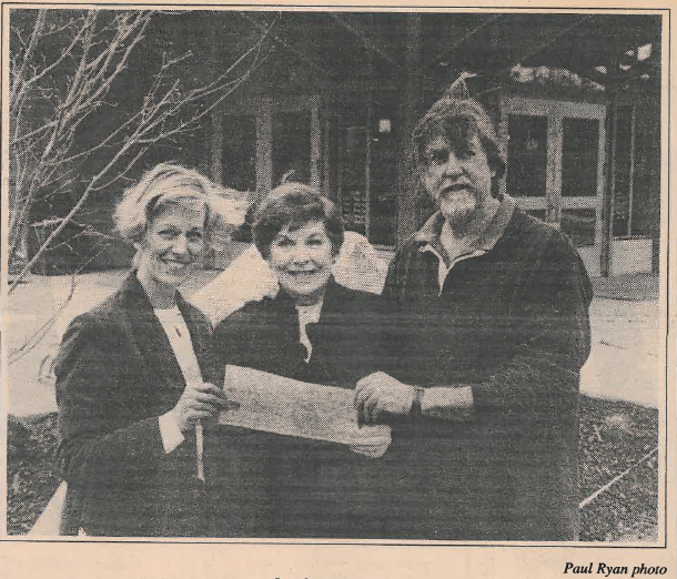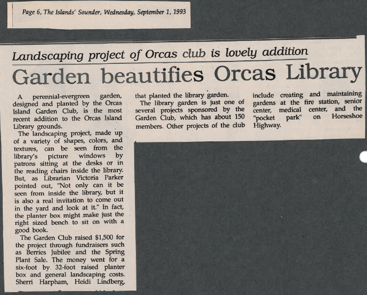 Orcas Island Librarian Victoria Parker accepts a $1,000 grant from Phyllis Wilkinson, treasurer of the Orcas Garden Club. Library board chairman Savvy Sanders had a grip on the check, too. The money will be used to help complete landscaping along the south and west sides of the library. In addition to ornamental grasses, junipers, flowering crabapple, and distinctive Chinese Wisteria vines for the pillars will be introduced.